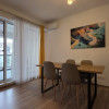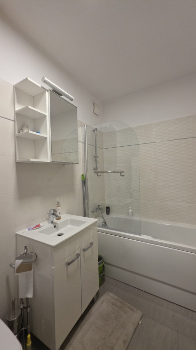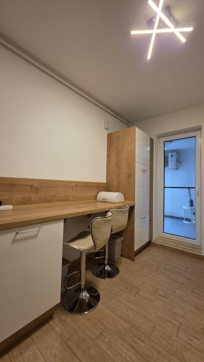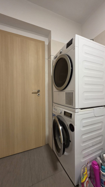Interiorul este modern, mobilat și utilat serios — cu mașină de spălat vase (bye-bye, certuri pe farfurii), mașină de spălat rufe + uscător electric (adică haine uscate în aceeași zi, nu peste o săptămână), și 2 aparate de aer condiționat, pentru zilele când Bucureștiul decide să fie Sahara.